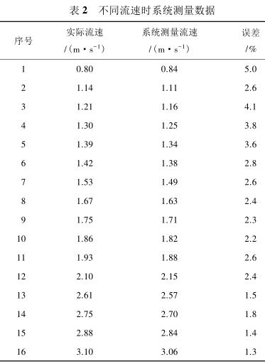 由表 2 測(cè)量數(shù)據(jù)可知,系統(tǒng)在測(cè)量低流速液體時(shí)(流速小于 1 m/s)誤差較大,達(dá)到 5%,當(dāng)待測(cè)液體的流速增大時(shí)(大于 1.4 m/s),誤差逐漸減小,基本維持在 3%以?xún)?nèi)。由此可見(jiàn)系統(tǒng)具有較高的檢測(cè)精度,尤其是當(dāng)管道中的液體流速較高時(shí),系統(tǒng)的檢測(cè)誤差不超過(guò) 3%,達(dá)到了設(shè)計(jì)預(yù)期。