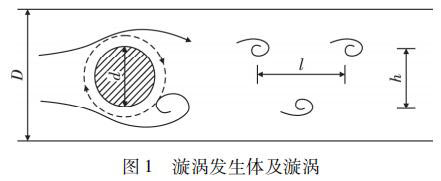 氫氣流量計(jì)是由漩渦發(fā)生體、頻率檢測(cè)器和信號(hào)轉(zhuǎn)換器等環(huán)節(jié)組成,輸出 4 ~ 20 mADC 信號(hào)或脈沖電壓信號(hào)。其測(cè)量原理是在流動(dòng)的流體中的垂直流動(dòng)方向安放 1 根或多根非流體型阻流體,在一定的流量范圍內(nèi),流體在阻流體兩側(cè)交替地分離、釋放出 2 串頻率正比于管道內(nèi)的平均流速、規(guī)則的、不對(duì)稱有規(guī)律的交替漩渦列,如圖 1 所示,且兩側(cè)漩渦旋轉(zhuǎn)方向相反。采用檢測(cè)元件測(cè)出漩渦頻率就可以推算出流體的流量。