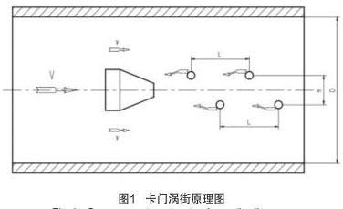 插入式壓縮空氣流量計(jì)實(shí)現(xiàn)流量測(cè)量的理論基礎(chǔ)是流體力學(xué)中**的“卡門渦街”原理,在流動(dòng)的流體中裝置一個(gè)非線性三角柱形體,即渦旋發(fā)生體,如圖 1 所示。當(dāng)流體沿渦旋發(fā)生體繞流時(shí),會(huì)在渦旋發(fā)生體下游產(chǎn)生兩列不對(duì)稱,但有規(guī)律交替地分離釋放出一系列漩渦束,只有當(dāng)兩渦漩列之間的距離 h 和同列的兩渦漩之間的距離 L 之比滿足 h/L=0.281 時(shí),所產(chǎn)生的渦街才是穩(wěn)定的。