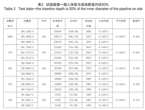 氣體渦輪流量計插入深度為現(xiàn)場管道內(nèi)徑的50%時,試驗數(shù)據(jù)如下(以 DN200 為例):