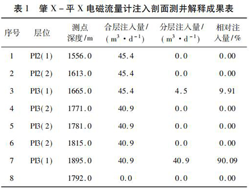 2017 年 9 月在大慶油田采油八廠肇 X - 平 X 水平井注水井中*次進(jìn)行了水平井注入剖面測井現(xiàn)場試驗(yàn)。該井斜深2 055. 42 m,水平段長度為568. 46 m,試驗(yàn)?zāi)康氖峭ㄟ^注入剖面測井了解該井各層段的注水情況,同時(shí)對水平井測井工藝、儀器的適用性、井下牽引器及井口輔助裝置等設(shè)備的工作有效性和可靠性進(jìn)行評價(jià)。現(xiàn)場試驗(yàn)中,在密閉條件下錄取到了該井的注入剖面測井資料,進(jìn)行了重復(fù)測量,重復(fù)測量結(jié)果在誤差允許范圍內(nèi),測井成果見表 1。該井施工壓力 6. 0 MPa,注入量45. 4 m3 /d,有 7 個(gè)射孔層,分 8 個(gè)測點(diǎn)測量,2 個(gè)層有吸入顯示,其中,P13( 1) ( 1 734 ~ 1 767 m) 層絕對吸入量4. 5 m3 /d,相對吸入量為9. 91 %,P13( 1) ( 1 899 ~1 943 m)層絕對吸入量 40. 9 m3 /d,相對吸入量為 90. 09% ,測井成果見表 1。通過與甲方的交流,再結(jié)合該井的動(dòng)靜態(tài)資料及周圍井的工作狀況,采油廠的地質(zhì)人員認(rèn)為本次測井結(jié)果能比較準(zhǔn)確地反映該井的注入情況。