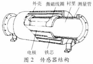 液體流量計(jì)由流量傳感器和轉(zhuǎn)換器兩部分組成。傳感器典型結(jié)構(gòu)示意如圖2,測(cè)量管上下裝有激磁線(xiàn)圈,通激磁電流后產(chǎn)生磁場(chǎng)穿過(guò)測(cè)量管,一對(duì)電極裝在測(cè)量管內(nèi)壁與液體相接觸,引出感應(yīng)電勢(shì),送到轉(zhuǎn)換器。激磁電流則由轉(zhuǎn)換器提供。