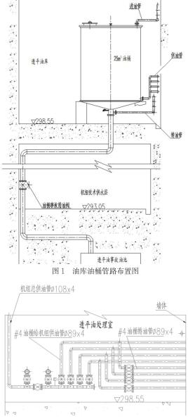 透平油油庫(kù)及油處理室設(shè)置在發(fā)電機(jī)出線層。油庫(kù)中安裝4個(gè)油桶,單個(gè)油桶容積為25m3。按照功能劃分為2個(gè)運(yùn)行油桶,2個(gè)凈油桶。每個(gè)油桶ding部設(shè)置一根油桶進(jìn)油管,油桶下部設(shè)置一根給機(jī)組供油管,油桶底部設(shè)置一根事故排油管,經(jīng)事故排油閥引入事故油池中,事故排油管上引出一根油桶排油管。各油桶的進(jìn)油管、供油管、排油管分別引入油處理室中。具體布置形式可見圖1所示。油處理室中設(shè)置一個(gè)容積為1m3的移動(dòng)油箱,用于向設(shè)備添油或臨時(shí)儲(chǔ)油。