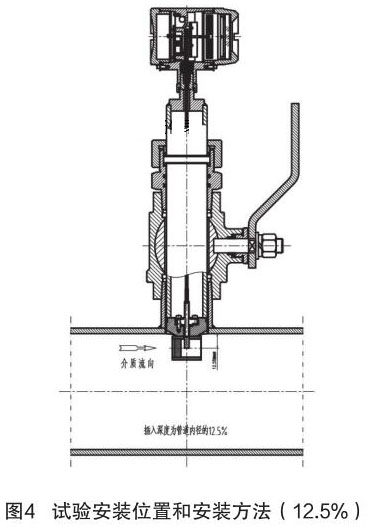 根據(jù)中華人民共和國機械行業(yè)標準:JB/T9249-2015《流量計》進行煙氣流量計的研制與設計。在試驗過程中,因為理論研究不充分,再加上經(jīng)驗不足,采用插入深度是按照以往其它產品(插入式電磁流量計)的經(jīng)驗,以插入深度為現(xiàn)場管道內徑的 12.5% 進行試驗,其對介質流量的檢測值與同種規(guī)格管道法蘭式結構的流量計進行比較,偏差值較大、儀表準確度無法滿足設計要求。試驗安裝位置和安裝方法如圖 4 所示。