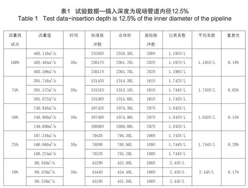 煙氣流量計插入深度為現(xiàn)場管道內徑的 12.5%時,試驗數(shù)據(jù)如下(以 DN200 為例):
