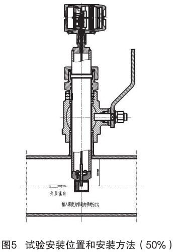 對插入式渦街流量計和插入式電磁流量計的結構原理進行分析,插入式電磁流量計的信號采集點在標校管道內12.5% 為宜,因它屬電磁類流量計,而流量計是根據(jù)“卡門渦街”原理進行測量管道內流量,根據(jù)標校管道內層流和湍流的分析,以及流量計獨特的探頭結構形式,確定煙氣流量計的插入深度為標校管道內 50%,試驗安裝位置和安裝方法如圖 5 所示。