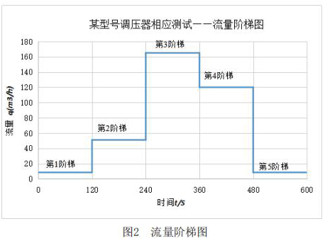 該測(cè)試主要利用實(shí)驗(yàn)室測(cè)試條件,模擬客戶(hù)現(xiàn)場(chǎng)使用情況。其主要測(cè)試內(nèi)容包括:測(cè)試電磁流量計(jì)在+23℃,-30℃和-40℃三種溫度下,電磁流量計(jì)出口壓力分別在2.1kPa和30kPa時(shí),流量分別從*1階梯到*5階梯時(shí)的響應(yīng)速度,客戶(hù)所提供的流量階梯如圖2所示。橫軸表示下游球閥開(kāi)啟動(dòng)作時(shí)間,縱軸表示高溫電磁流量計(jì)下游需要的流量q。