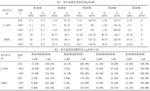 為了深入研究溫度及流量突變對(duì)高溫電磁流量計(jì)響應(yīng)速度的影響趨勢(shì),把每個(gè)流量突變點(diǎn)前后的出口壓力p2,流量q列表如表1所示。