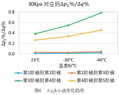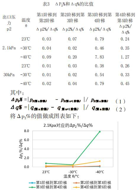 為了更直觀嚴(yán)謹(jǐn)?shù)膶?duì)比每個(gè)階段響應(yīng)速度的不同,對(duì)原始數(shù)據(jù)進(jìn)行處理,得到如下表格2和表格3。將△p2%/△q%作為響應(yīng)速度的直觀量化表達(dá),若△p2%/△q%的值大,說(shuō)明單位流量變化照成的出口壓力變化大,即說(shuō)明電磁流量計(jì)響應(yīng)相對(duì)較慢,反之亦然。
