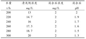 (2)加酸期間附企水處理公司人員負(fù)責(zé)每0.5h在高架水槽處化驗(yàn)污環(huán)水pH值,每2h監(jiān)測(cè)一次高架水槽內(nèi)掛片腐蝕情況,將化驗(yàn)結(jié)果告知燃?xì)鈲徫蝗藛T,崗位職工負(fù)責(zé)記錄。當(dāng)pH小于6時(shí),附企給水人員在高架水槽處加入堿液進(jìn)行調(diào)整,同時(shí)根據(jù)洗滌塔循環(huán)水量變換情況調(diào)整清洗劑濃度見表3。