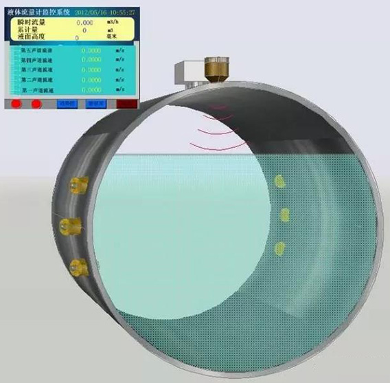 超聲波流量計的工作原理是,借助時差式測量原理,通過一對超聲波探頭發(fā)射信號穿過中間介質到達另一側管壁,被另一個探頭接收到,另一側探頭同樣發(fā)射信號被*一個探頭接收到。在這個過程中,由于信號的輸送時間受介質流速的影響,所以,存在一定的時間差?;诖耍暡髁坑嫿柚嚓P公式計算出了相應的流量值。