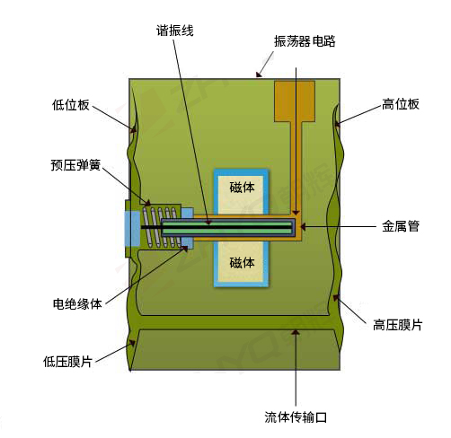 由磁場驅(qū)動的振蕩器電路會導(dǎo)致導(dǎo)線以其共振頻率振蕩。導(dǎo)線的一側(cè)牢固地固定到靜態(tài)部件,而另一側(cè)則連接到膜片。彈簧使電線預(yù)緊。由于過程壓力對隔膜的影響,金屬絲將在壓力升高時拉伸,而在壓力降低時收縮。共振頻率將相應(yīng)地增加或減少。數(shù)字計數(shù)器測量諧振頻率的變化,并將其信號傳遞給微芯片,該微芯片還處理線性化補償和溫度補償。