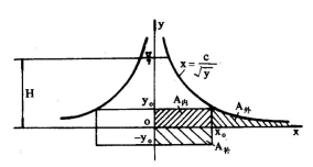 即縱坐標y值趨近于零時,橫坐標x值趨近無窮大。這在堰板的實際制作上是無法實現(xiàn)的。若將堰口曲線的*低縱坐標取為yo,在yo一下至(-yo)增開一矩形,即高為2yo,寬為2x。的補償孔,從數(shù)學上可以證明,坐標原點以下所增大的矩形面積(A補)正好等于舍去的曲邊面積(A補)。由圖3可知