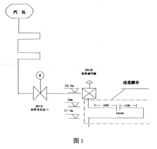 異形孔板安裝在鍋爐30米處連排管段,截去一段加裝U形管段的來流直管段上,根據(jù)安裝要求,測點(diǎn)位置選在距離上游直管段1810mm,距離下游直管段1085mm處。符合“距離上游直管段>10D(D=56mm,管道內(nèi)徑),距離下游直管段>5D”的要求??装宓娜汗転榇怪毕蛳?,圓缺孔板的弦與管道橫截面水平中心線平行安裝。其改造安裝圖如圖1所示。