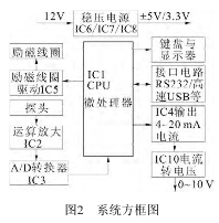 裝置采用模塊(裝置采用模塊(STM32F217STM32F217)來控制電磁流量)來控制化工污水流量計(jì)選型的工作,包括產(chǎn)生勵(lì)磁脈沖方波信號(hào)、接收從探頭計(jì)的工作,包括產(chǎn)生勵(lì)磁脈沖方波信號(hào)、接收從探頭送來的反映流量大小的微弱電信號(hào)、輸出送來的反映流量大小的微弱電信號(hào)、輸出4~20mA電流信號(hào)供指示儀表用,模塊附帶有各類接口電路電流信號(hào)供指示儀表用,模塊附帶有各類接口電路(RS232、高速USB接口等)。裝置包括:接口等)。裝置包括:IC1單片機(jī)、IC2前置放大器、IC3A/DIC3A/D轉(zhuǎn)換器、IC4電壓轉(zhuǎn)電流模塊、IC5勵(lì)磁線圈的驅(qū)動(dòng)模磁線圈的驅(qū)動(dòng)模塊電路、IC6電壓轉(zhuǎn)換模塊,以壓轉(zhuǎn)換模塊,以及USB快速接口電路、IC9芯片與周圍元件組片與周圍元件組成的RS232接口等電路。方框口等電路。方框圖如圖2所示。