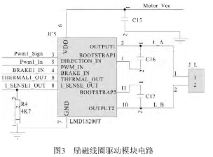 由于探頭尺寸較小,所產(chǎn)生的勵(lì)磁電流很弱,由于探頭尺寸較小,所產(chǎn)生的勵(lì)磁電流很弱,要處理這樣的信號(hào),則后續(xù)的放大電路要有足夠高要處理這樣的信號(hào),則后續(xù)的放大電路要有足夠高的輸入阻抗和較大的增益,來保證傳感器的靈敏度的輸入阻抗和較大的增益,來保證傳感器的靈敏度及抗干擾性;為了防止交流及抗干擾性;為了防止交流50Hz的工頻干擾,選的工頻干擾,選用方波電流作為勵(lì)磁電流,其頻率選用用方波電流作為勵(lì)磁電流,其頻率選用12.5Hz,它是1/4的工頻頻率,這樣可有效地抑制工頻干擾。勵(lì)磁信號(hào)在單片機(jī)內(nèi)部生成,從*勵(lì)磁信號(hào)在單片機(jī)內(nèi)部生成,從*26腳輸出12.5Hz方波信號(hào),接到勵(lì)磁線圈的驅(qū)動(dòng)模塊電路方波信號(hào),接到勵(lì)磁線圈的驅(qū)動(dòng)模塊電路IC5(LMD18200T LMD18200T)的3腳信號(hào),它的內(nèi)部采用腳信號(hào),它的內(nèi)部采用H橋式驅(qū)動(dòng),送出勵(lì)磁電流加到其橋式驅(qū)動(dòng),送出勵(lì)磁電流加到其2腳和10腳之間的勵(lì)磁線圈上。在勵(lì)磁線圈L上形成20~30mA方波電流,它與控制方波電壓同步。使流體運(yùn)動(dòng)切割波電流,它與控制方波電壓同步。使流體運(yùn)動(dòng)切割磁力線產(chǎn)生的方波電壓與勵(lì)磁電流完全保持同步, 磁力線產(chǎn)生的方波電壓與勵(lì)磁電流完全保持同步,這樣也便于在接收放大電路中信號(hào)的同步解調(diào)。電路如圖3所示。