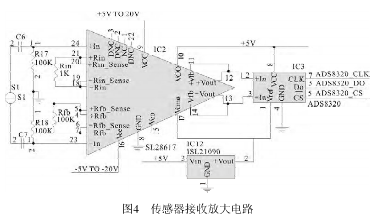 IC2(SL28617)放大器用于放大傳感器送來)放大器用于放大傳感器送來的反映流量大小的電壓信號(hào),圖中的反映流量大小的電壓信號(hào),圖中Rin和Rfb是用來改變運(yùn)算放大器增益的電阻。來改變運(yùn)算放大器增益的電阻。S1是勵(lì)磁信號(hào)源,R17、R18是輸入偏置電阻,運(yùn)放的是輸入偏置電阻,運(yùn)放的9腳和16腳分別接電源±腳分別接電源±5V,接在運(yùn)放IC2輸出端的IC3(ADS8320 ADS8320)是16位高速A/D轉(zhuǎn)換器,其轉(zhuǎn)換速度可達(dá)16kHz/s,接在接收放大器與接在接收放大器與A/D轉(zhuǎn)換器之間的IC12(ISL21090 ISL21090)是三端穩(wěn)壓器。電路如圖)是三端穩(wěn)壓器。電路如圖4所示。