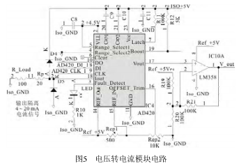 IC4(AD420)是一塊電壓轉(zhuǎn)電流模塊,可將電壓信號(hào)轉(zhuǎn)換成電流信號(hào)輸出,輸出電流范圍是4~20mA或0~20mA,其后面可以接模擬指示儀表。接其后面可以接模擬指示儀表。接在其輸出端的IC10(LM358)是運(yùn)放,可將輸出電流轉(zhuǎn)換成電壓輸出,電壓輸出范圍流轉(zhuǎn)換成電壓輸出,電壓輸出范圍0~10V。電路如圖5所示。